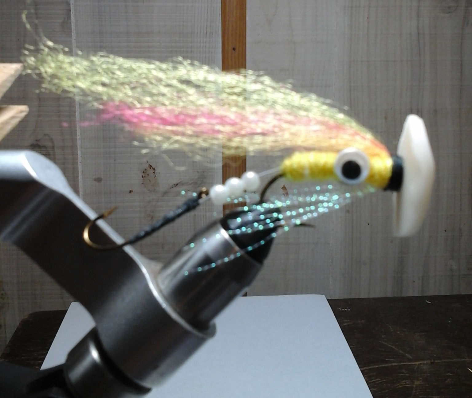 | Wing | Congo/synthetic hair (color depends on the baitfish imitated or streamer pattern used. Here I use a Mickey Finn because it\'s a classic streamer) |